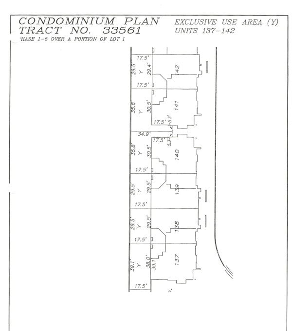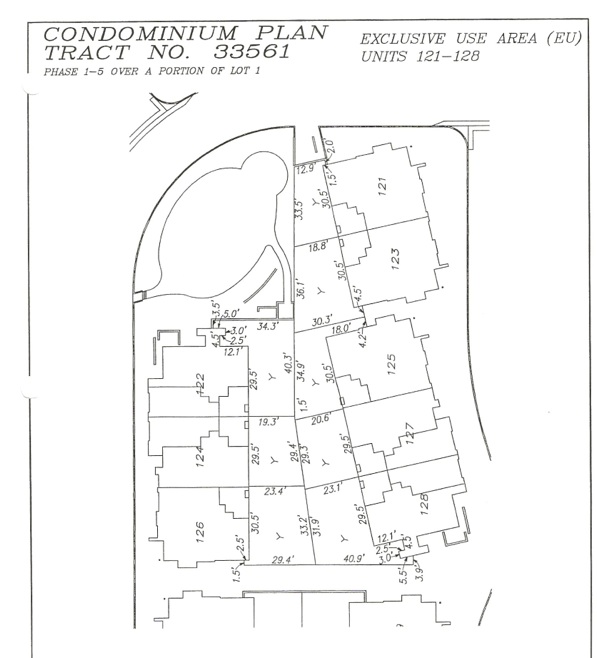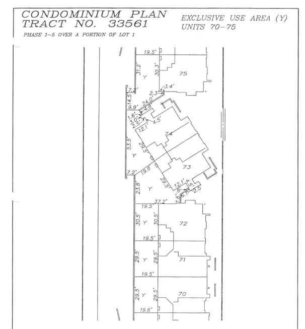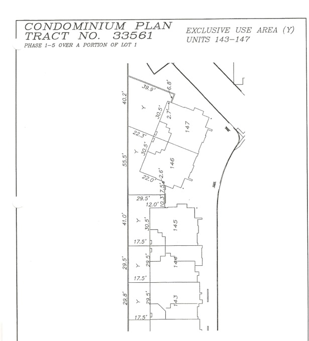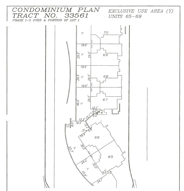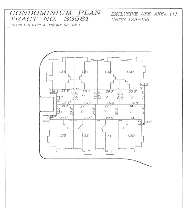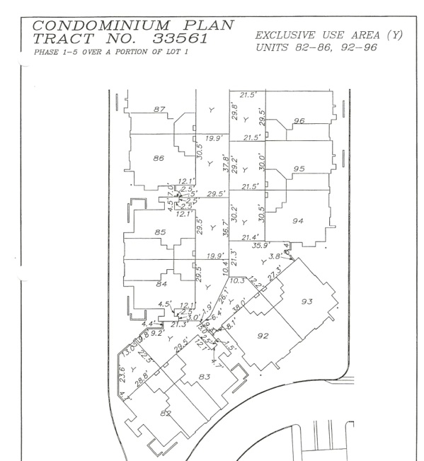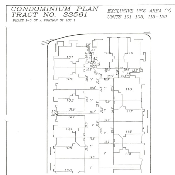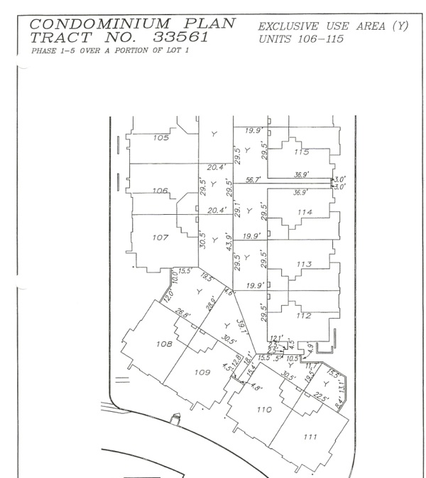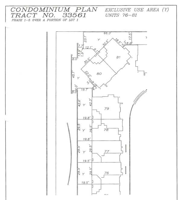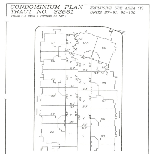 These 11 drawings show the shapes and dimensions of the back yards of the two-story, two-bedroom Palermo townhomes, indicated by unit number rather than street address. If you do not know the particular unit number of the condo you’re interested in, check the larger map below of the Palermo community for reference. Please note: These drawings show the yards for built condos with unit numbers 65 to 147. The lower numbered townhomes haven’t yet been constructed.